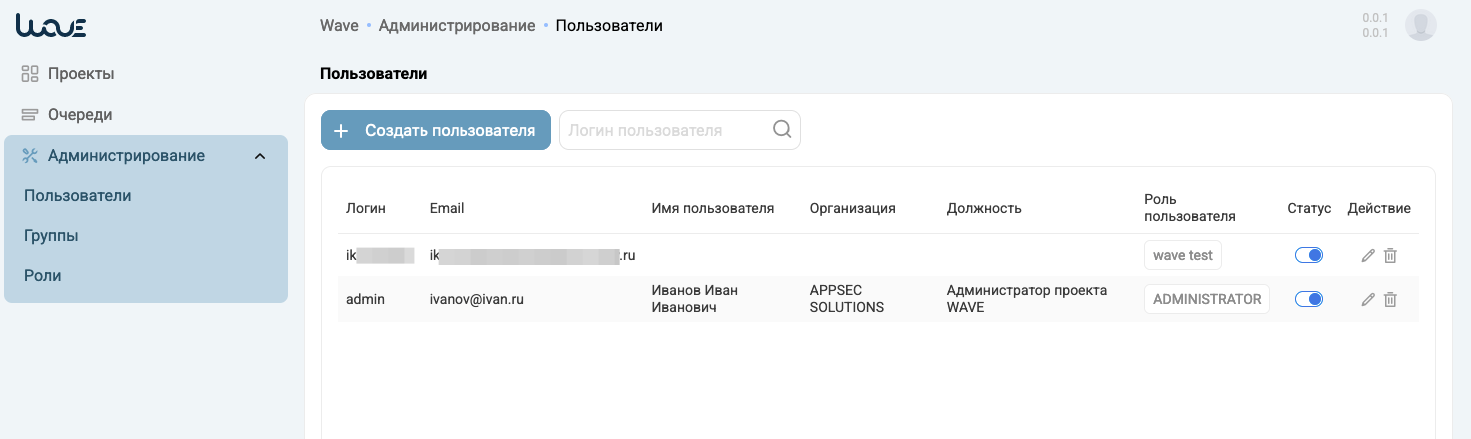 - Статус пользователя (активен, неактивен). С помощью переключателя, находящегося в этом столбце, пользователя можно временно блокировать.