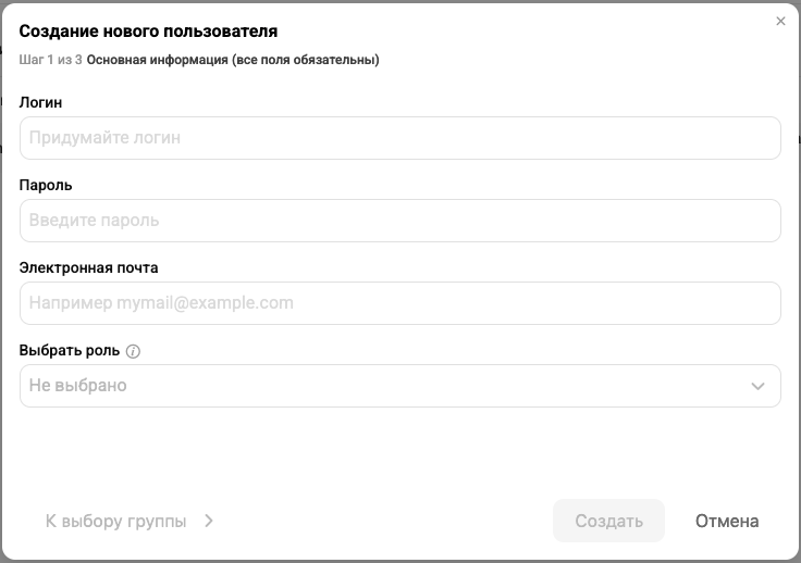 В окне Создание нового пользователя на шаге 1 введите Логин, Пароль, Электронную почту и выберите роль пользователя в Системе из выпадающего списка.