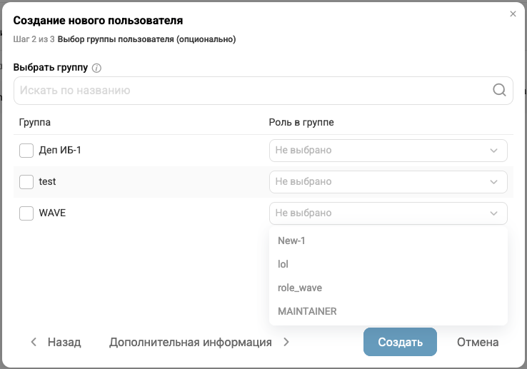 На шаге 2 можно задать принадлежность пользователя к существующим в Системе группам. Для этого необходимо выбрать группу или группы и в каждой из них выбрать для пользователя роль в группе из выпадающего списка. Без выполнения этого шага пользователь не будет иметь возможности работать с проектами в Системе.