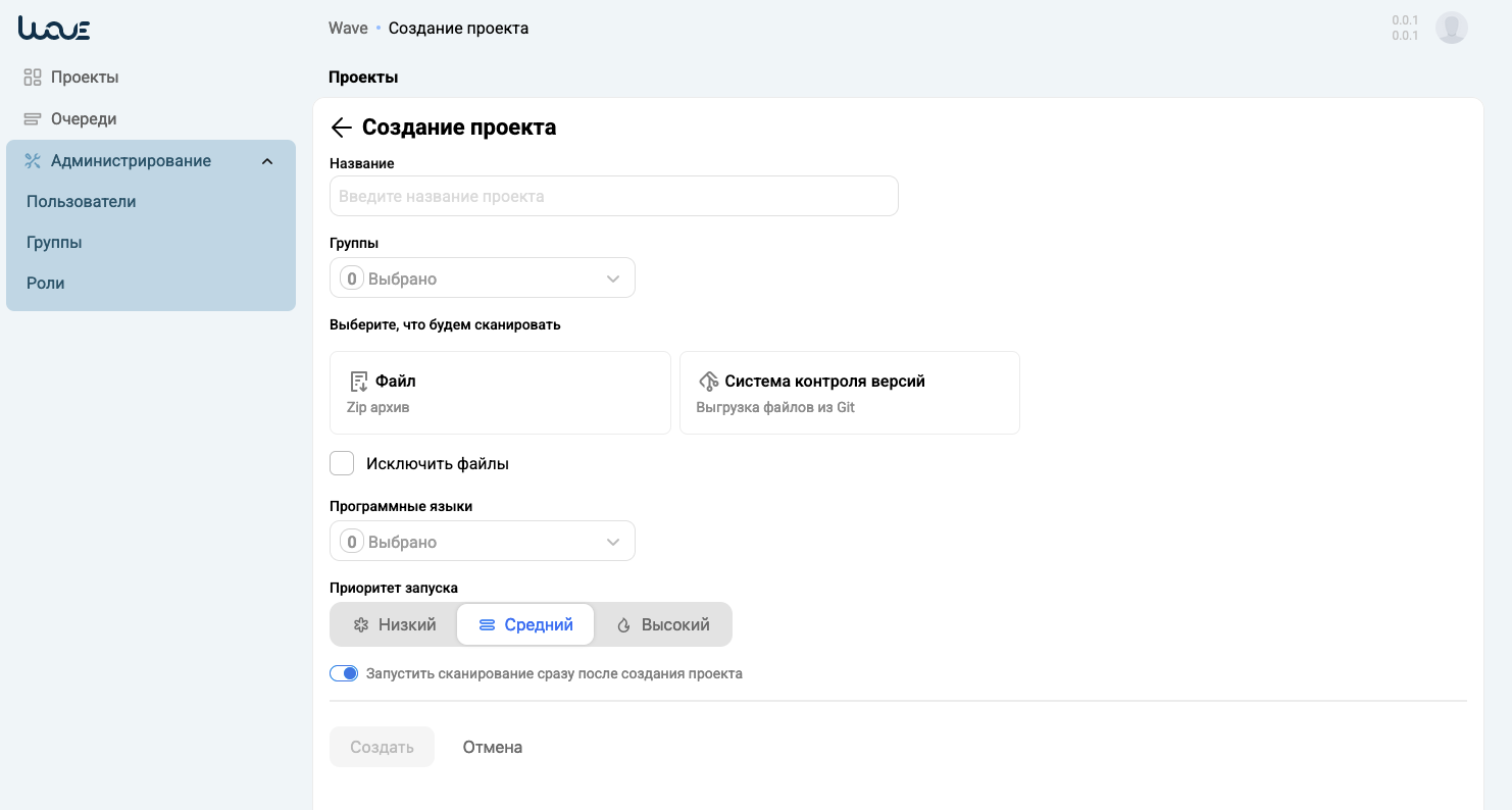 - Установите для проекта Приоритет запуска сканирований в соответствующем поле. Этот параметр важен при большом количестве проектов и выполняемых сканирований в Системе. Высокий приоритет позволит продвинуть сканирование проекта в начало очереди.
