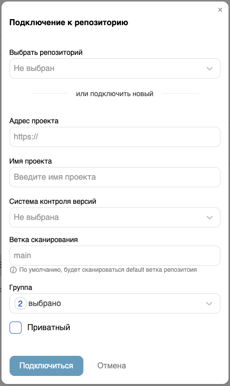 - В поле Выбрать репозиторий можно выбрать репозиторий, ранее уже подключенный к Системе (отображаются только репозитории, относящиеся к группам, в которые входит пользователь). В этом случае в поле Ветка сканирования можно выбрать ветку из списка веток, существующих в репозитории (по умолчанию будет сканироваться default ветка репозитория).
