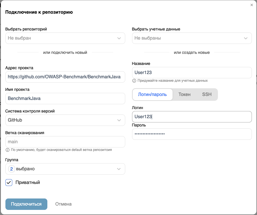 При использовании приватного репозитория установите флажок Приватный. Далее необходимо либо выбрать ранее сохраненные учетные данные из выпадающего списка (отображаются только учетные данные, относящиеся к группам, в которые входит пользователь), либо создать новые, указав для них Название и задав Логин/пароль, Токен или SSH. При подключении к приватному репозиторию проводится валидация вводимых данных.